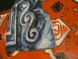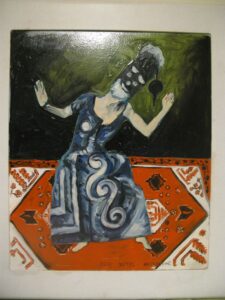 It is a tribute to the feminine need for theatricality that often turns ceremonial. This is a ceremonial/magical dance of invocation. The mask is from Thrace, the carpet is a Hamedan Shahsavand from Persia.