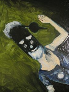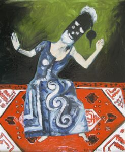 Maskentanz 1 belongs to the series inspired by the Weimar culture: a woman* with a paganistic mask dancing on a nomadic carpet