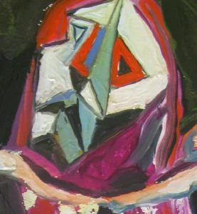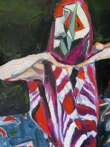 It is a tribute to the feminine need for theatricality that often turns ceremonial. This is a ceremonial/magical dance of invocation. The mask is from an older painting of mine (some 45 years ago) that actually depicted an eternal stability and stagnation in the form of an eternal sleep.